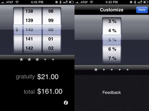 Gratuity ($1) by TapeShow is perhaps the most bare bones tip calculator we’ve seen at its price point. It offers wheel pickers for entering the check amount, plus a rating of one to five stars which sets the tip percentage—tapping the info button allows the user to set custom tip percentage values for each star.