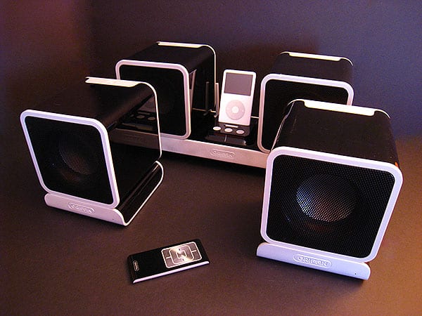 The idea behind Evolve was extremely smart: rather than just offer another clone of the $300 Bose SoundDock, Griffin developed a visually stunning $300 system with two large, battery-powered cube speakers that rested on top of a matching wireless and charging base with an iPod dock. You could dock an iPod in one room, then hear and control the speakers up to 100 feet away, placing each one on the charging base, or carrying them temporarily to different rooms, a porch, or wherever you happened to be walking. A packed-in RF remote control let you control the iPod and speakers, including tracks, volume, and more. Griffin built the speakers to run for around 10 hours off their battery packs, and be swappable: you could make the left speaker work as the right speaker, or vice-versa, or set both speakers to monaural mode, just by touching them to the right side of the charging base or flipping a stereo/monaural switch. And it included a feature that couldn’t be exploited until now: Evolve could actually perform music through additional speakers, potentially creating a whole-home wireless audio solution.