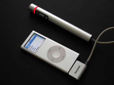 If you understand the concept of karaoke – generally embarassing, but fun public singalongs to famous songs – Griffin’s new iKaraoke will make sense to you. At first blush, you’ll notice that the microphone and automatic on-screen iPod software are unique in that they work with any track already on your iPod, and instead of requiring you to use a line-out port, iKaraoke has a built-in FM transmitter that lets you sing through any nearby FM radio, all cool features that merited our 2006 Accessory Innovation of the Year award.