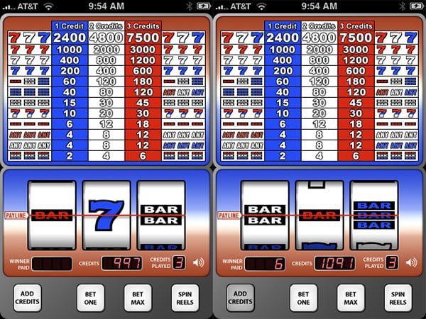 As the other Griffin Technology gambling game for the iPhone, Lucky 7 Slots is just about as compelling as the first. 5 Card Touch was video poker, stripped of its casino cabinet trappings; Lucky 7 Slots is a one-line slot machine in all of its questionable glory. If you’ve ever actually ventured into a casino—probably with a lot less than $1,000 to drop on a single slot machine—you probably know that the least exciting slot you’ll find in the whole place is the one with a single pay line running through three rotating wheels.