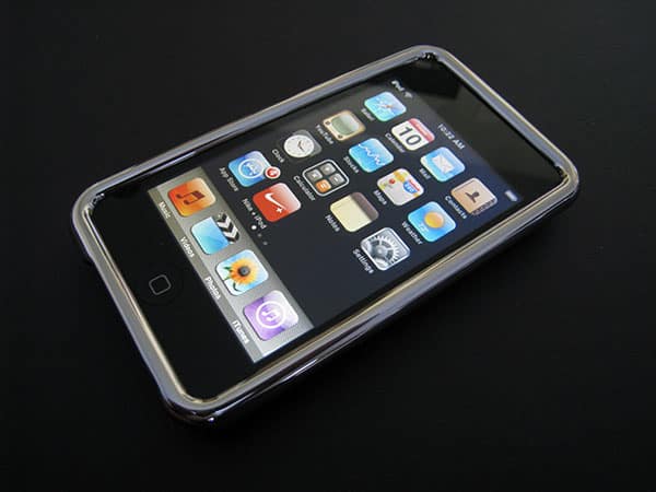 Reflect for iPod touch 2G is literally nothing more than iClear made from different materials. Here, the front bezel is made from mirror-finished plastic, while the back uses a soft touch black rubber on a hard black plastic shell. Griffin includes the same screen protector and cleaning cloth as are found in iClear. But the change in body materials makes a major cosmetic difference here: thanks to the new iPod touch’s chrome front bezel, Reflect now accentuates the touch’s existing front look rather than changing it, while protecting the back of the device with a nicer-looking dark cover.