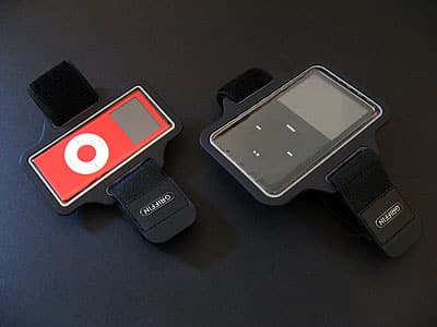 Currently available in two sizes — one for iPod, and one for iPod nano — and now planned for an August or September release for iPhone, Griffin’s Streamline ($30) is a simple, convenient armband and case design for active users, with nicer looks than the company’s earlier Tempo armbands. Each Streamline consists of a hard plastic shell with a full clear soft plastic face protector and a soft neoprene back and side protector.