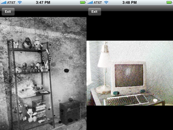 Unfortunately, the apps do not let the user apply the filters to a saved image, limiting their usefulness. Once an image has been decided upon, each application applies a different filter to the image, saving it to the Camera Roll and displaying the resulting image to the user on a simple screen with an exit button. Images are saved in 1600×1200 resolution, the maximum possible resolution of the iPhone’s camera.