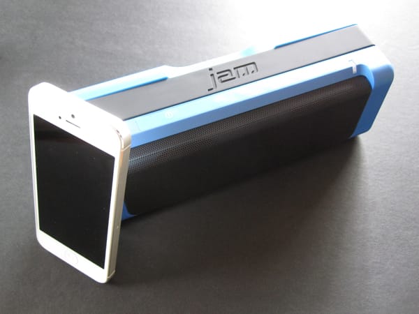 Thanks to all of the components noted above, Jam Party certainly doesn’t feel underdesigned, but it doesn’t have the sort of unified aesthetic polish or millimeter-obsessive engineering we’ve seen in top $100 speakers from companies such as JBL and Soundfreaq. For instance, the top control bar of our review unit didn’t quite match the blue color of the rest of the unit, seams are visible on all of Jam Party’s sides, and its twin 1.5” speakers are easily spotted inside hexagonal recesses behind the front speaker grille. Moreover, despite possessing similar enough audio hardware, Jam Party is quite a bit bigger than the Jambox, JBL’s Flip, and most of their peer-priced rivals. One gets the sense that it could have been more conveniently smaller without any sonic compromises had the pop-up handle just been left out.