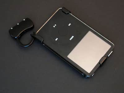 Pros: A metal security device made for one specific iPod model – here, the 30GB fifth-generation iPod – combining a back plate with a detachable combination lock. Provides complete access to all iPod ports and controls while in use; available in five colors.