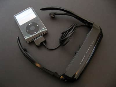 Pros: A pair of lightweight wearable video goggles designed specifically for the iPod, featuring the simplest iPod connectivity we’ve yet seen – one cable direct from the goggles to the iPod, capable of running on low enough power consumption to let you watch between 3 and 7 hours of iPod video, depending on the 5G iPod you own. Large apparent screen size is easy to see, aided by independent eye adjustment knobs, and an immersive design.