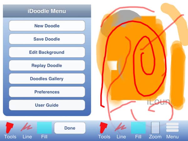 iDoodle offers a number of common drawing tools, including pen, line, rectangle, oval or custom shapes, an eraser, and on the paid version, the text and eyedropper features. Users can adjust the color of the line or fill by picking from 16 pre-determined colors, or by tapping an advanced button that uses RGB sliders to choose the color; the paid version also lets users pick two colors for gradient fills.