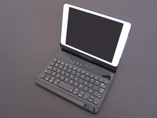Because of the hinge, the iPad can be positioned anywhere from 45° to 90°, and there’s enough tension that it’ll stay at whatever angle you put it at in-between. Bluetooth pairing is about as easy as it gets, with an on-off switch and a large, dedicated pairing button next to it, both found on a glossy border above the keyboard. Then there’s the keyboard itself. Laid out with five rows, it has numbers combined with secondary iOS-function keys, and then a QWERTY collection of keys beneath that. The keys are physically very small. Although we expected typing to be limited due to cramping, however, we actually found ourselves moving pretty quickly, without much of an issue in accuracy. If there’s any problem, it’s with the apostrophe: instead of having its own dedicated key in-between the colon and return, it’s mapped as a function of the L key.