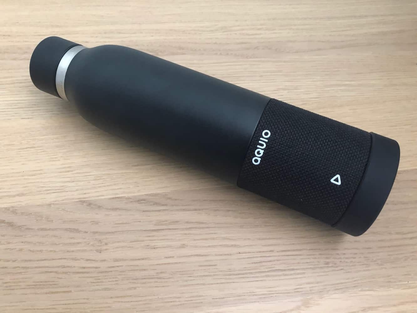 Screwed on to the bottom of the water bottle is a five-watt Bluetooth speaker wrapped in woven fabric.