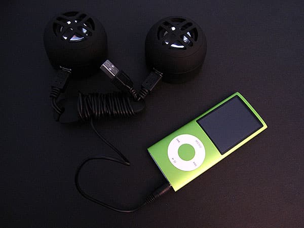 iHM77 instead includes two smaller, dome-shaped speaker drivers with their own rechargeable batteries, a fabric carrying pouch, and a cord-managed combination USB power recharger and auxiliary audio cable.