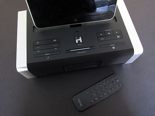 We’ve loved Apple’s Universal Dock design for the four or five years it dominated iPod and iPhone accessories, as the shallow well and slightly extended Dock Connector made it possible for these accessories to work with iPods and iPhones regardless of whether they were inside most cases. But the iPad’s release forced companies to completely reconsider the whole docking concept, as no iPad could conceivably squeeze into the traditional sub-3” Universal Dock well, and providing everything from multi-device support to case compatibility could easily have been a problem. iA100 meets this challenge efficiently, placing a rubber-tipped metal bar behind a modestly elevated, flexible Dock Connector that sits inside a groove large enough for almost every iPad case we’ve seen and tested. This new dock design isn’t small, but it should work with basically any iPod, iPhone, or iPad you might have, and looks completely inoffensive… except for a large black rubber insert iHome includes to fill the groove when it’s not needed. Though there mightn’t be a better inexpensive solution, this insert looks a little cheap when it’s not being shadowed by an encased iPad. Most people won’t care; only the ability to rotate the iPad would make it considerably better.