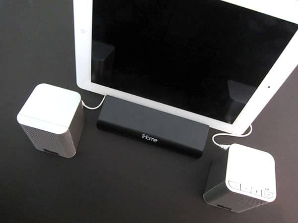 The story with iDM15 is fairly classic iHome, offering thoughtful design and good value for the dollar, plus respectable rather than mindblowing audio quality. For the price, you get two silver battery-powered speakers, as well as a hard plastic carrying box that converts into an iPad/iPad 2 stand. Volumetrically, the compacted-down speakers and box occupy approximately 50% more space as the BTS200, but when they’re expanded out with the included cabling—one wire to connect the speakers, and a dual wire for charging and auxiliary audio input—you have what looks like a much larger audio platform, complete with the benefit of wider stereo separation.