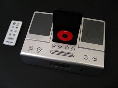 Pros: An all-in-one briefcase-ready clock, dock, and speaker system for Dock Connector iPods and shuffles, including a good Infrared remote control, wall power supply, and travel case. Runs off of AA and lithium clock battery power when not connected to the wall, comes in three colors. Cheapest remote- and clock-equipped travel speaker we’ve seen for the iPod to date.