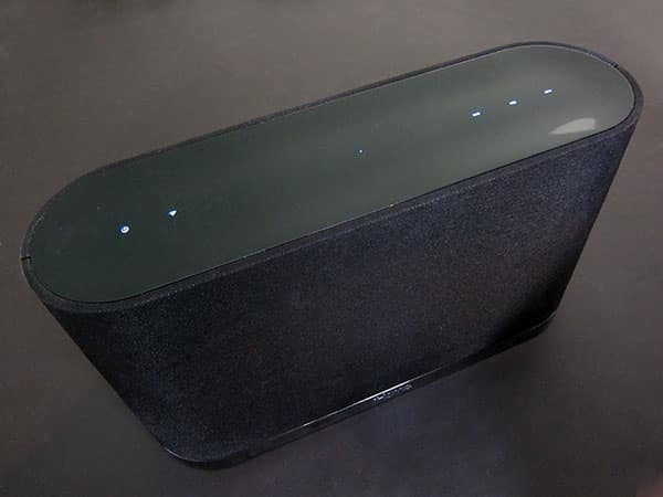 iW1’s shape is there to accommodate the built-in rechargeable battery and included charging base. The unit can be lifted off of a table, placed anywhere, and enjoyed for between 4-15 hours depending on volume—4 hours at full volume, 15 hours at 50%. As a general rule, since the Wi-Fi connection continues to draw power, you’ll want to keep it on the charging base except for the periods when you actually need the portability. Refueling the cell is as easy as bringing iW1 back over to the charging base and setting it down, a design innovation that was awesome when first revealed and even now feels really smart. The charging base is matte black plastic, matching a rear panel on iW1, which is otherwise comprised entirely of wraparound black fabric with a glossy black plastic top and a mirrored black chrome bottom. Apart from their tendency to attract fingerprints, the top and bottom surfaces scream class, and do a great job of turning what otherwise could have been a plain shape into a premium-looking product.