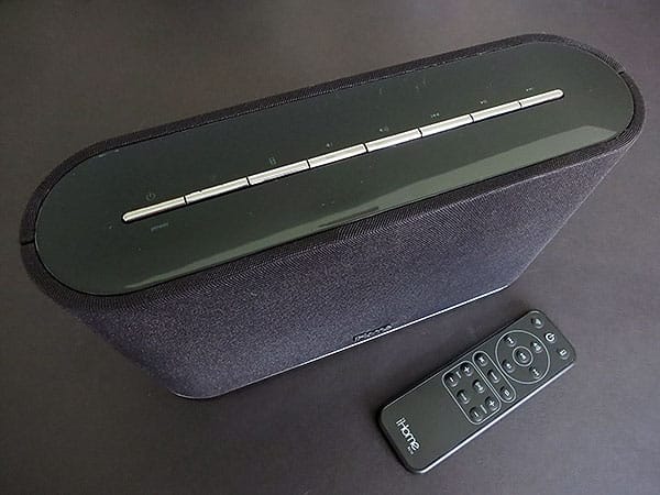Start with the fact that iW2 is a considerably smaller system, measuring roughly 10.5” wide by 5.8” tall by 3” deep versus iW1’s 12.5” wide by 7.3” tall by 3.7” deep—an inch or two less here and there, plus a commensurate weight reduction of nearly two pounds, falling to 4.6 from 6.5. Despite these changes, iHome has kept all of iW1’s great looks for the iW2, down to the black chrome bottom ring and wraparound fabric speaker grille, while merely shrinking the extruded pill-shaped enclosure proportionately. It has also retained the rear USB port and included Dock Connector cable that enable you to attach an iOS device for initial setup or wired audio playback, plus the Ethernet port for a wired connection to a router.