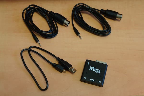 The package also includes two 5-foot 2.5mm to 5-pin DIN MIDI cables, as well as a micro-USB charging port and cable to provide power to the iOS device for longer sessions. Two LEDs display activity on the MIDI IN and OUT channels.
