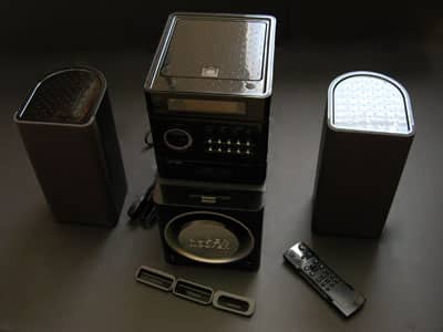 It’s available in glossy white and black versions, each with four main components and a 20-button Infrared remote control, making a strong collective visual statement when unpacked. In addition to the necessary connecting cables, there are two 10” by 5” by 6” freestanding speakers, a box containing a 4” subwoofer, and a second box with an illuminated volume knob, LCD screen, control buttons, and most of the unit’s other selling points. There’s an MP3-CD player, AM/FM radio with digital PLL tuner and 40 presets, one USB port, and a SD/Memory Stick/MMC card reader. Despite all these input options, this second box doesn’t look cluttered: the CD player is a top-loading design with a pop-up lid, while a panel underneath the box’s main set of 14 buttons (four black, 10 silver) hides the USB port and memory card reader until they’re needed.