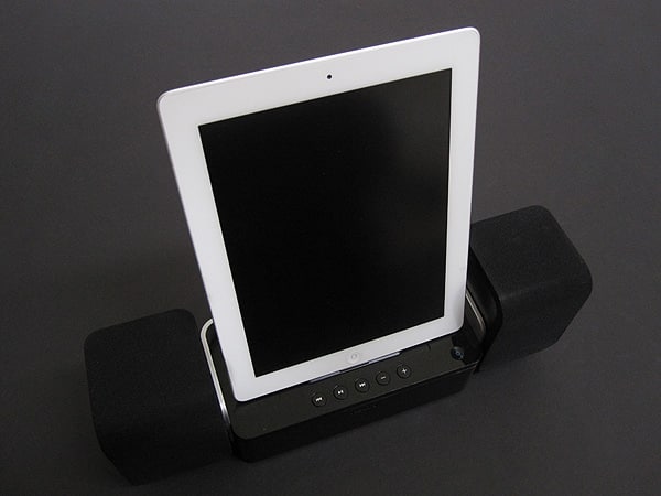 If you’re looking for a speaker dock that fits not only iPhones and iPods, but iPads as well, iLuv’s iMM747 Hi-Fidelity Speaker Dock ($130) is an option. Available in either black or white, this system is sometimes also known as Audio Cube, a name that makes sense when you see the speakers on either side of the dock.