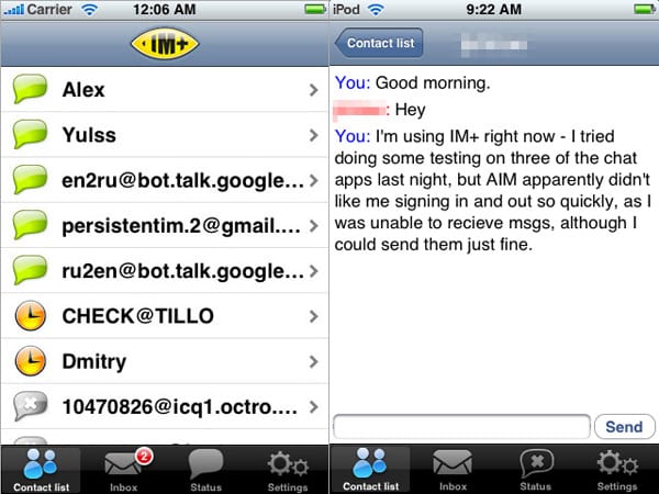 IM+ (Free) is yet another multi-platform IM application, offering support for AIM, Yahoo!, MSN, Google Talk, Jabber, ICQ, and MySpace messaging. Like most competing apps, IM+ uses a bottom-tabbed interface for navigation, with selections for contact list (buddies), inbox (chats), status, and settings, the last of which offers access to both app and account settings.