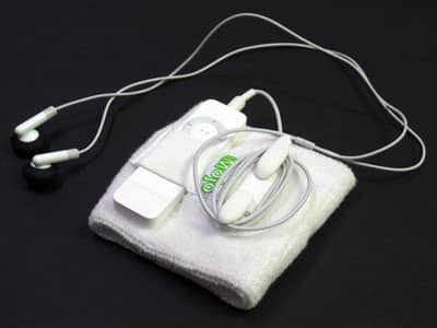 Of the options we’ve recently tested, we liked iMojo’s shuffle Sweats ($18.95/2-pack) the most. Based in Venice Beach – home to the original Gold’s Gym -iMojo came up with a soft sweat band for the forearm that includes two proprietary additions: an elastic strap and a hard rubber headphone cord manager. The strap is divided into two parts by a plastic sewn-in iMojo logo, and independently holds both the rubber manager and your iPod shuffle.