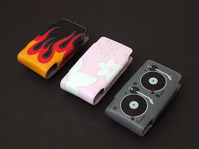 There are three colored and stitched leather exterior versions: Flame resembles the fire-on-black boys’ t-shirts that became popular a few years ago, with stitching to highlight the red and orange twists of flame. Flower is a girly pink and white case with stitching in floral patterns, while Turntable features two ink-drawn old school record turntables next to each other, but no stitching outside of the case’s contours. Each case’s rear features an Incase logo and an integrated, non-removable belt clip, and their insides are made from anti-scratch soft suede lining. Unlike the DC Shoes Sleeve, which proved difficult for iPod mini insertion and removal, the Leather Sleeves are thankfully easy enough to put on and pull off.