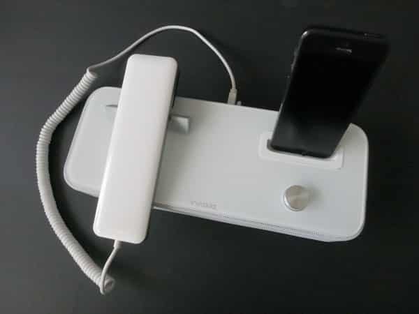 This isn’t to say that Audioffice lacks for aesthetic appeal. In our prior review, we noted that “Invoxia has done such a great job with the industrial design of NVX 610 that we were beyond excited just to see it sitting on a desk.” Only modestly tweaked, that design continues to be Audioffice’s single biggest selling point. White, gray, and silver with an Apple-like transparent top surface, the new Audioffice measures 11.4” wide, 5.55” deep, and 2” tall, sporting a traditional cabled telephone handset on its left and an iPhone-sized dock recess on its right. Should you want to use it with an iPad, an included plastic insert attaches to its back to hold the tablet in place, and Invoxia now includes three types of connectors—Lightning, Dock Connector, and micro-USB—so you can make a charging connection with any docked device. The handset has been redesigned a bit relative to NVX 610’s, now featuring a matte white interior with a less obviously iPhone 4-inspired silver band on its edge, but still retains a black ear speaker at the top and tiny microphone hole at the bottom.