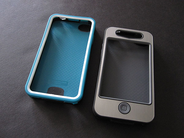 Fuze SE, on the other hand, is more like the Fuze that we’re used to from the past: the core is plastic, but it’s lined with rubber on the inside and brushed metal on the outside. Instead of just running around the sides, it covers all of the bezel with a cutout for the sensors, earpiece, and FaceTime camera at the top. The Home button is covered by a matching rubber button. iSkin has completely gotten rid of the screen protection we’ve seen from the past two editions, which first arrived as a separate sheet, and then was integrated into the front cover; each Fuze leaves your iPhone’s screen open.