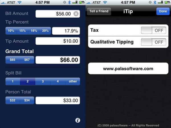 With decent tip calculation and check splitting features and an interface that, while not exactly slick, wasn’t put together as an afterthought, iTip is a solid choice at its $1 price.
