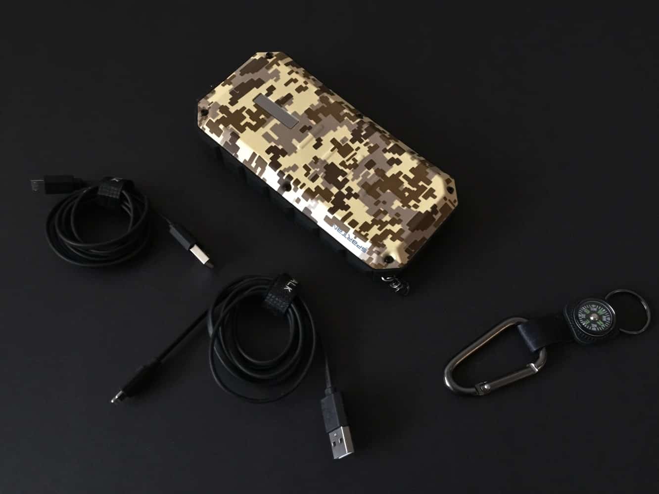 The battery also includes a flashlight and small loop to accommodate an included carabiner hook with compass. A micro-USB cable and Lightning cable also come with Extreme Spartan, as well.
