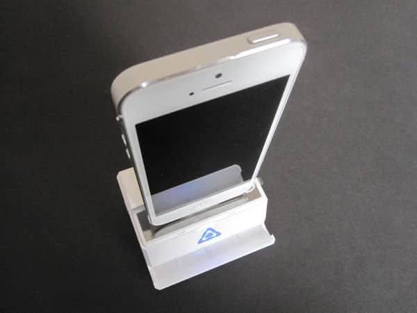 To access Link 5200i’s Lightning plug, you lift off a cap along the top. It’s on there pretty tight, with a small divot in the middle of the seam for your fingernail. Underneath, three’s a mirrored surface with the plug jutting up from the center, surrounded by plastic that severely limits case compatibility. When you put a bare iPhone on, it stands straight up and down, rather than at an inclined angle.
