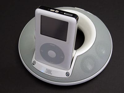JBL’s new On Stage speaker system for the iPod presents an even more interesting challenge for iLounge’s readers and editors alike. In essence, On Stage packs 90% of the Creatures’ sound quality into a significantly smaller and novel disc-shaped enclosure. Unlike the Creature system, On Stage is specifically designed as a combined iPod dock and sound system, including everything you need to connect an iPod for easy, immediate enjoyment with speakers. The only hitches are two: unlike other small iPod speaker systems released recently, On Stage is not truly portable. And it sells at a substantial premium ($199.00) over the Creatures – $20 more than Altec Lansing’s recent and fully portable iM3 inMotion speakers, which we noted were at the very cusp of acceptable pricing even given their numerous packed-in accessories.
