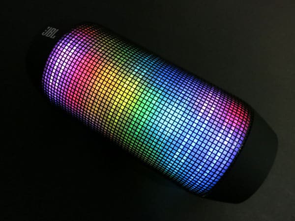 The major difference between Flip and Pulse becomes obvious when the newer model is turned on. JBL doesn’t make a big deal about the specs or capabilities of the LED lighting system, but there’s an array of 72 independent lights inside Pulse, each in the shape of an equal sign or boxy S.