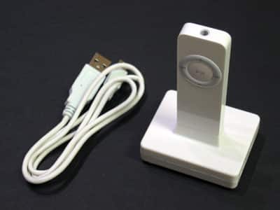 But JP’s Charger is considerably smaller and made from all white glossy plastic rather than trying to match the Mac mini, though it narrowly misses a color match with the iPod shuffle and has rough seams on its sides. JP’s also includes a short, detachable white USB cable, which connects to the Charger’s right surface – this cable is more than a foot shorter than Apple’s, and considerably shy of the one included with Pacific Rim’s Shuffle Cradle (iLounge rating: A-).