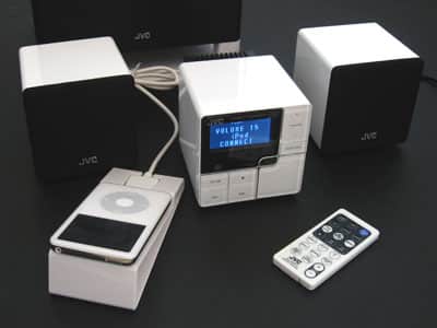 As JVC’s first Apple-sanctioned Made for iPod speaker system, the NX-PS1 ($250) offers a cube-shaped alternative to the white multi-component speaker systems offered by companies such as JBL and iHome. We’ve opted to do only a capsule review of this system because of its very modest iPod integration, which struck us as being of afterthought quality, rather than a fully realized design.