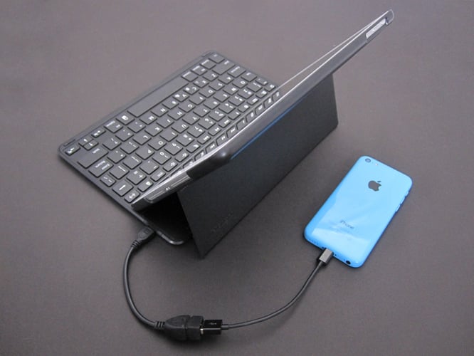 Again, the most noteworthy part of this accessory is its charging capability, which Kensington dubs PowerLift. The adapter included for this purpose is short, measuring 5.75” from end to end, and you must provide your own charging cable. Once it’s hooked up though, it works well. Kensington notes its “PowerLift feature will be disabled when the battery level is less than 20% to preserve power for keyboard use.” We were able to charge an iPhone 5 to 84 percent in one test before the battery switched off, and 79 percent in a second test.