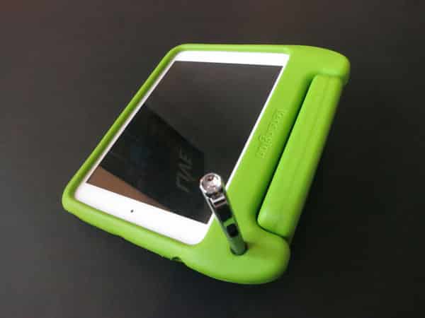The foam case has a hinged-handle that can also act as a stand. This one includes a stylus, which can fit into a groove on the back, as well as screen film and an applicator. It only comes in green.