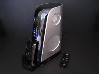Pros: The first multi-driver speaker system for iPods to pack three standard drivers and a dedicated subwoofer into a tall tower-like enclosure rather than a larger footprinted horizontal design. Delivers reasonably balanced sound with enough bass to satisfy mainstream users, and decent stereo separation, despite the narrowness of the chassis. Slide-out iPod dock helps to further conserve space. Includes carrying case and Infrared remote control.