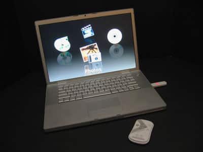 This new combination of RF radio transmitter and receiver can be connected to any Macintosh computer with Front Row – G5 or Intel – and enables you to control Front Row’s features from promised 60+ foot distances, or through walls.