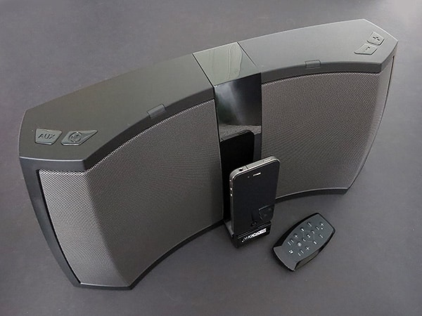 This time, rather than recessing the central 30-pin Dock Connector within a restrictive and iPod-only nook, Kicker places it front and center as part of a glossy plastic stripe that divides large perforated metal speaker chambers. As the Dock Connector is flush with the plastic, it works with unencased iPads, iPhones, and iPods, but won’t make an electronic connection to most encased devices.