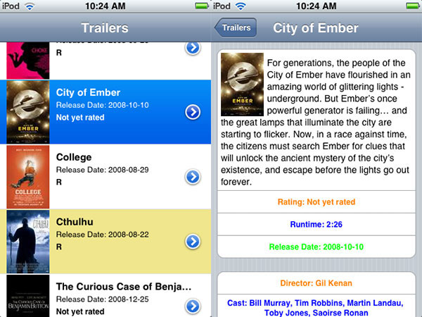 Clicking on any of the listings brings up the movie’s trailer, available on EDGE, 3G, or Wi-Fi data networks, while clicking on a small arrow icon opens a short page of descriptive text.