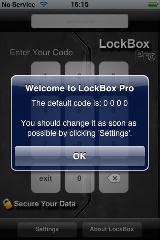 LockBox provides PIN-based (numeric) log on security, and a fairly general free-form storage model. Information and notes fields are supported, but fields cannot be named and are all general text-based fields with no validation or field masking capabilities.