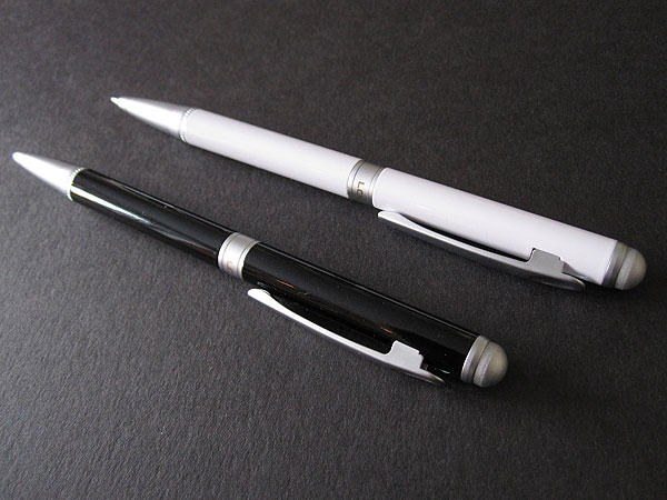 Available with either a black or white barrel, it’s composed of a standard ballpoint pen with a twist-to-expose mechanism for the pen tip.