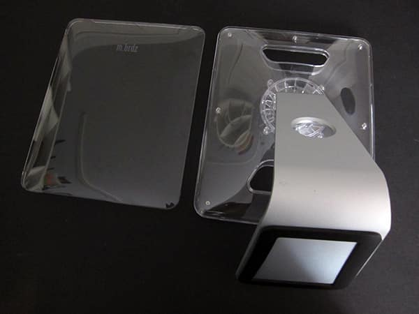 The clear plastic rear housing rotates on a machined aluminum base resembling the leg of a recent iMac computer, complete with a cable hole in the back; a thin clear iPad shell doubles as a half-case and a mount integration system to connect the tablet to the stand when you want to keep it upright on a flat surface.