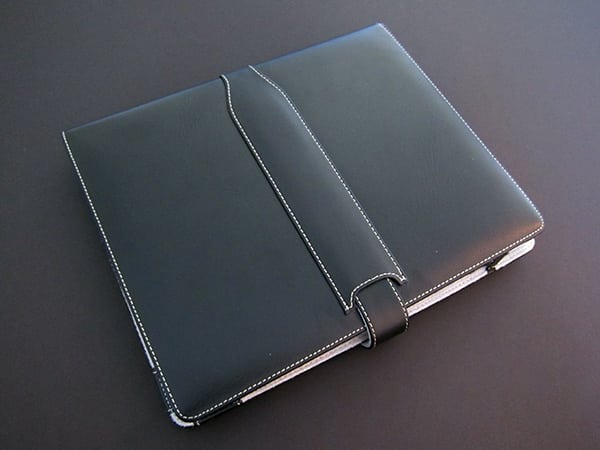 M-Edge’s Executive Jacket ($50-$60) is a leather flip-style case with a plush fabric interior and the ability to be used as a horizontal stand. Distinctive in the design are a very long front tab to hold the case closed, and three pockets on the inner front flap opposing the iPad, which is held in place by two leather and two elastic corner grips.