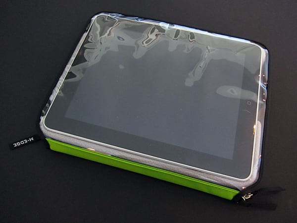 E-reader case maker M-Edge has just released Leisure Jacket ($50), a ripstop nylon case featuring a high density foam frame for protecting the iPad and a clear vinyl front cover that allows the iPad to be used while still encased. The zippered design turns out to be important: the iPad doesn’t stay securely within the foam frame unless the case’s front is zipped up, and due to the use of twin zippers, you may need to reposition both of them relative to the top, side, or bottom port or switch you need to access at a given moment; the buttons and touchscreen work fine. A thin zippered pocket on the back of the case can be used for storage.