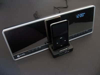 Pros: A visually unique and impressive combination of an iPod speaker dock, customizable dual alarm clock, and radio with solid AM and FM tuning, employing a flat mirrored panel as a stereo speaker surface. Reasonably priced given its looks and features, very good default sound right out of the box.