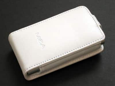 The French-language product names and web site of MCA (Manhattan Cellular) are intended to convey a sense that there’s something special and fashionable about the company’s cases, and to some extent that’s true. Each of the Hautes Coutures cases we’ve looked at is at least visually interesting, and the Snow Case for iPod mini (39 € (Euros), approx. $48.00) is no exception: it’s a white, all leather PDA-style case with a soft suede interior and two sets of silver snaps.