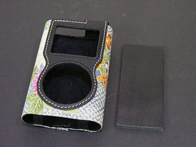 Another piece of black leather holds a good-sized metal D-eyelet on each case’s upper back for use with a wrist or bag strap. Miyavix’s logo, “Miyavix Kyoto,” appears on a matching black fabric tag on the cases’ backs. Black fabric also lines both cases to protect the iPods against scratching. Finally, a thick black leather insert is included with every full-sized Kimono case to let it work with 20GB iPods, as well.