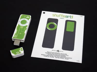 Pros: Professionally made vinyl iPod shuffle stickers that are water resistant and nicely textured, using good quality adhesive that doesn’t come off too quickly unless you want it off – in which case it leaves no goo.