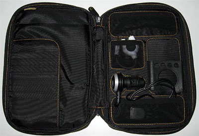 Like several other confusingly named Monster accessories, the iCase is branded “incase” on its exterior and interior tags, so you’d never guess it was a Monster product but for the box and some interesting accessories. As it turns out, the iCase was developed for Monster by a company named Incase, and the subtitle on the box explains its different marketing approach: it’s a “Travel Pack for iPod.” Larger than its competitors by many times, the case is depicted on its packaging simultaneously holding an iPod, five different accessories (including a full iPod dock), an iPod CD, a collection of different Flash media cards, a PCMCIA card, a map, and a pen. Because you never know when you might need all that stuff. Ahem.